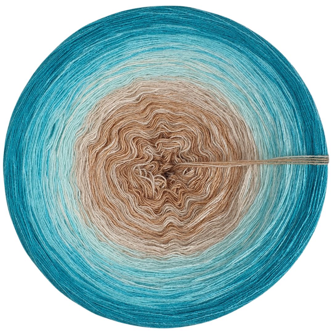 Unsere Modalverläufe sind gefachte Garne bei denen mehrere Fäden nebeneinander liegen und den Arbeitsfaden bilden. Der Farbverlauf entsteht dadurch, dass einzelne Fäden von einer Farbe zur nächsten verknotet werden. Damit die Knötchen im fertigen Stück kaum bis gar nicht mehr sichtbar sind, schneiden wir sie kurz ab. Dadurch lässt sich das Garn auch super verarbeiten, da keine Fäden vernäht werden müssen. Unsere Modalbobbel wickeln wir außerdem standardmäßig mit gleich langen Abschnitten, sodass sie von innen und außen abgearbeitet werden können.