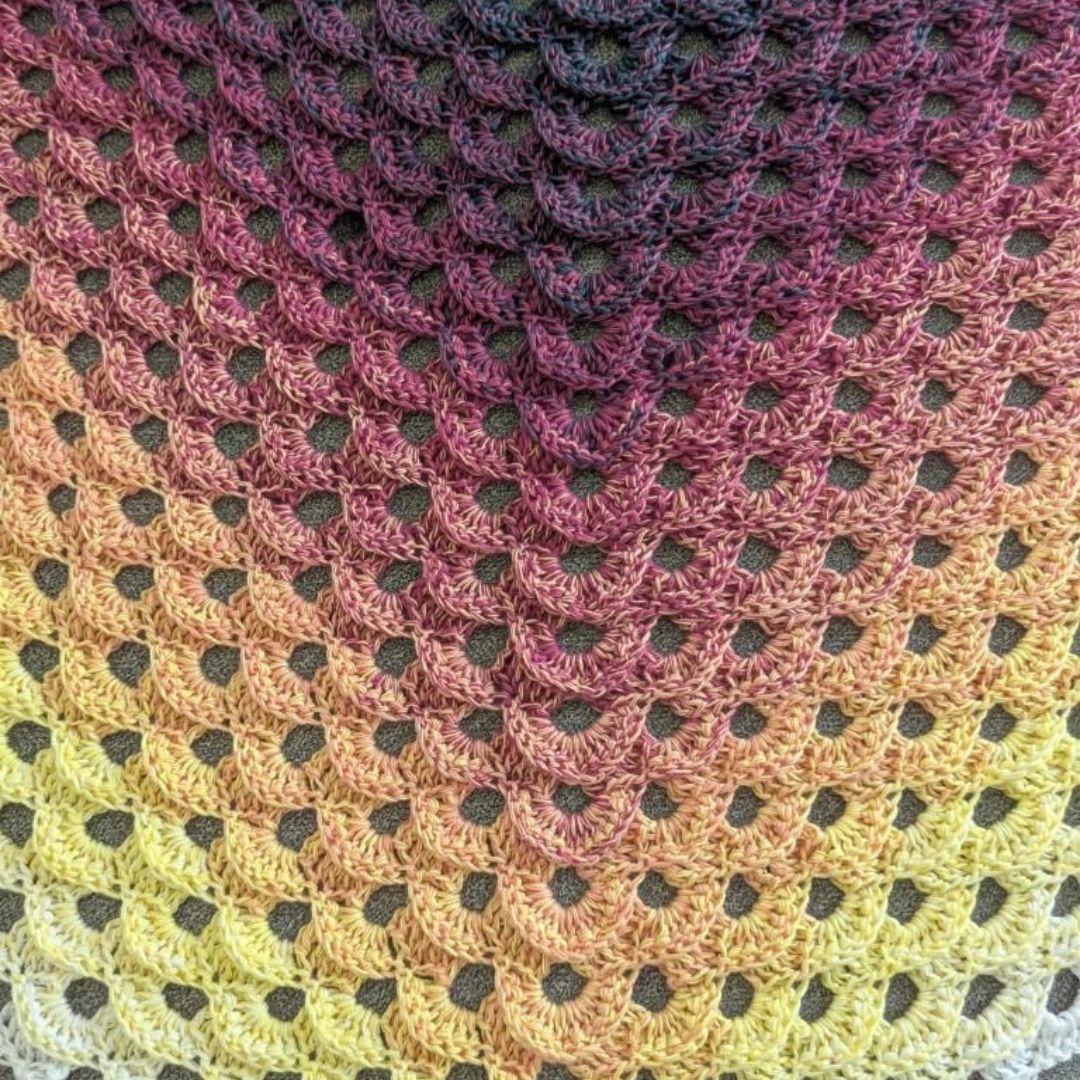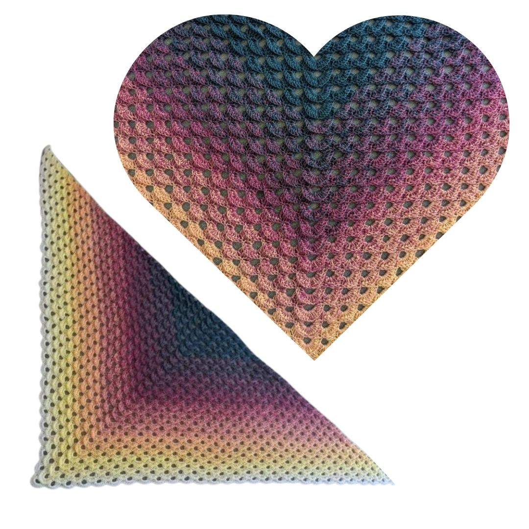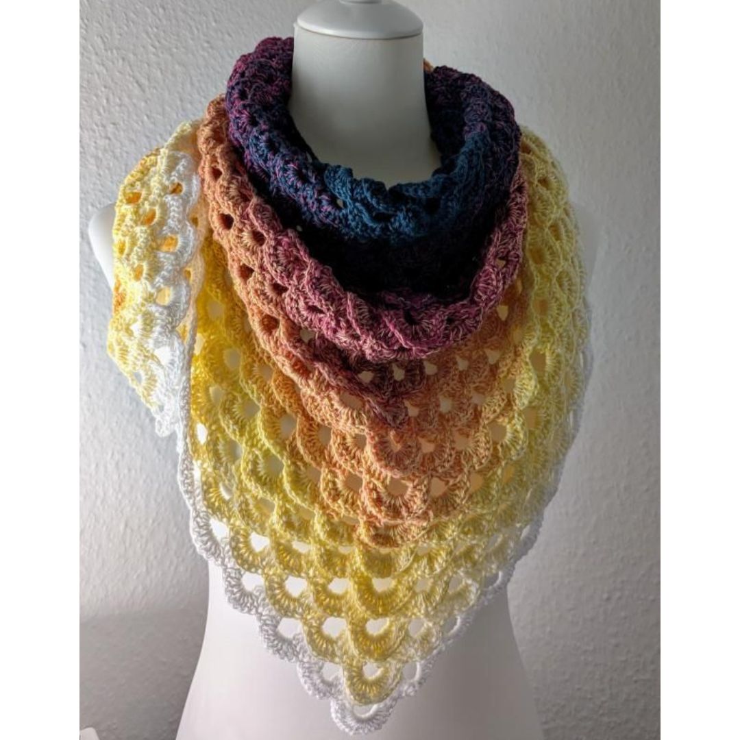 Tipp: Das Beispieltuch wurde von der lieben Ines vom Youtube-Kanal "Wollige Zeiten" gehäkelt. Die Anleitung zum Nacharbeiten findest du hier: Dreieckstuch-Herzensfreude
