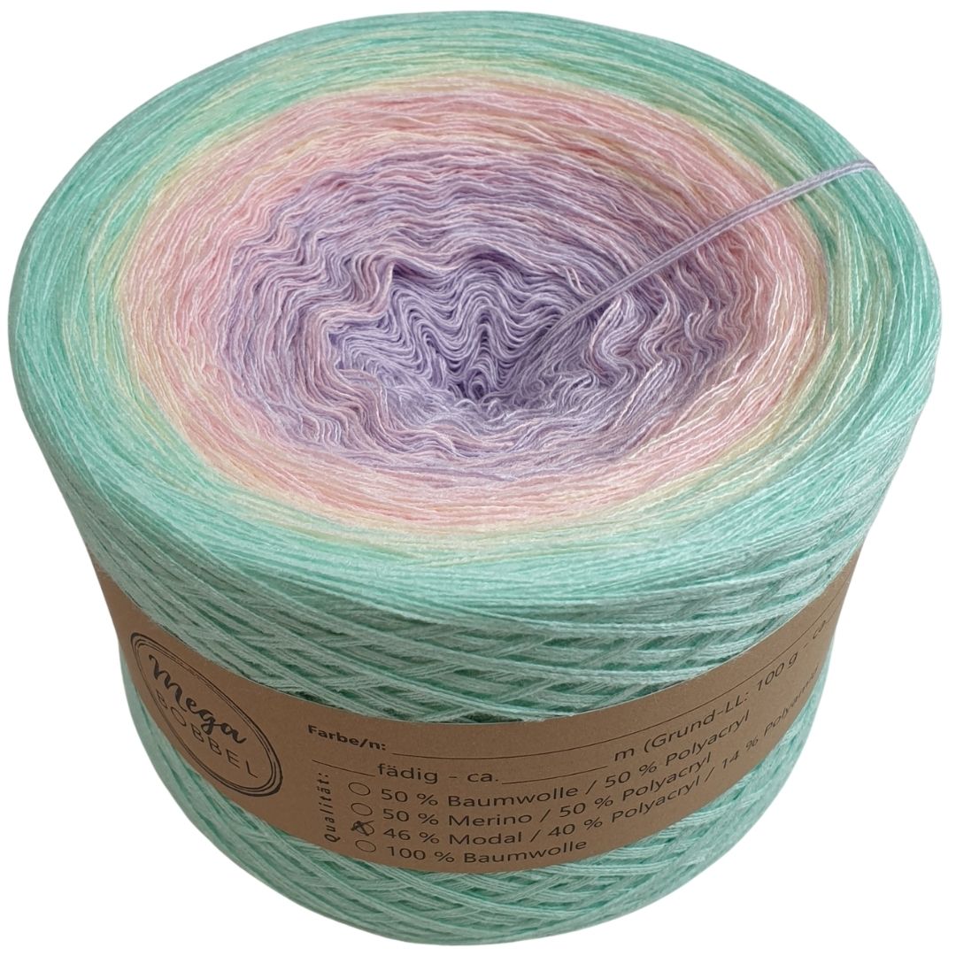 Unsere Modalverläufe sind gefachte Garne bei denen mehrere Fäden nebeneinander liegen und den Arbeitsfaden bilden. Der Farbverlauf entsteht dadurch, dass einzelne Fäden von einer Farbe zur nächsten verknotet werden. Damit die Knötchen im fertigen Stück kaum bis gar nicht mehr sichtbar sind, schneiden wir sie kurz ab. Dadurch lässt sich das Garn auch super verarbeiten, da keine Fäden vernäht werden müssen. Unsere Modalbobbel wickeln wir außerdem standardmäßig mit gleich langen Abschnitten, sodass sie von innen und außen abgearbeitet werden können.
