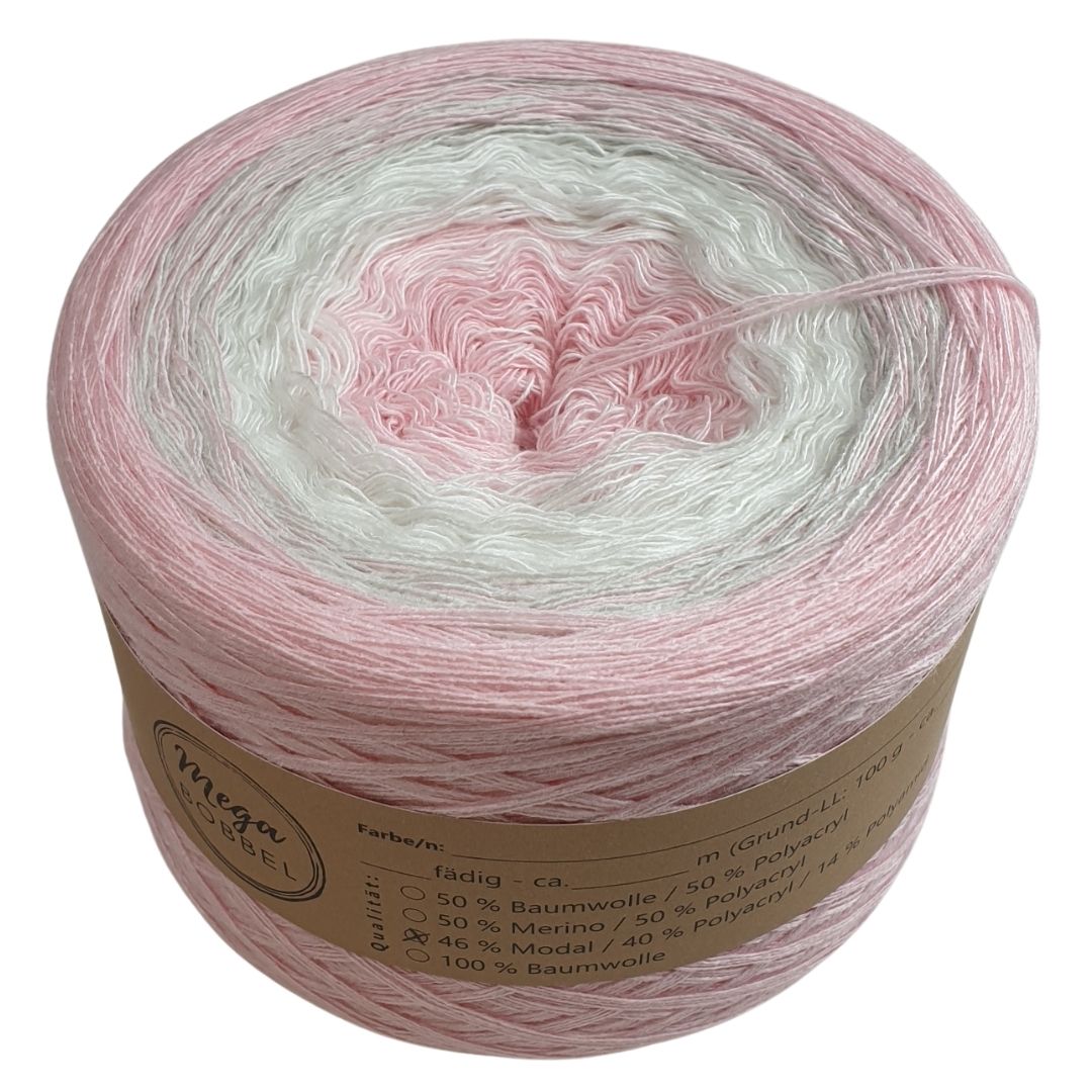 Unsere Modalverläufe sind gefachte Garne bei denen mehrere Fäden nebeneinander liegen und den Arbeitsfaden bilden. Der Farbverlauf entsteht dadurch, dass einzelne Fäden von einer Farbe zur nächsten verknotet werden. Damit die Knötchen im fertigen Stück kaum bis gar nicht mehr sichtbar sind, schneiden wir sie kurz ab. Dadurch lässt sich das Garn auch super verarbeiten, da keine Fäden vernäht werden müssen. Unsere Modalbobbel wickeln wir außerdem standardmäßig mit gleich langen Abschnitten, sodass sie von innen und außen abgearbeitet werden können.