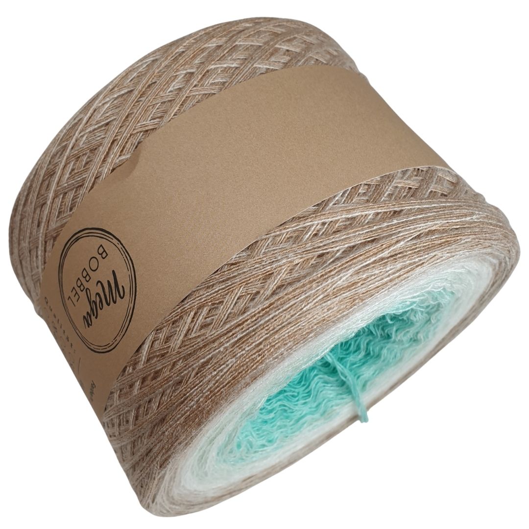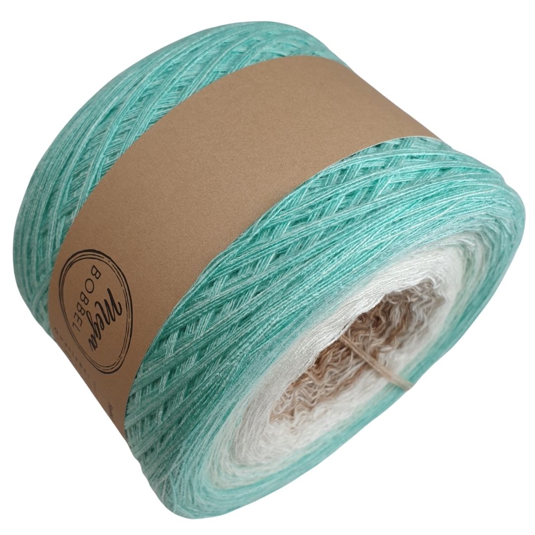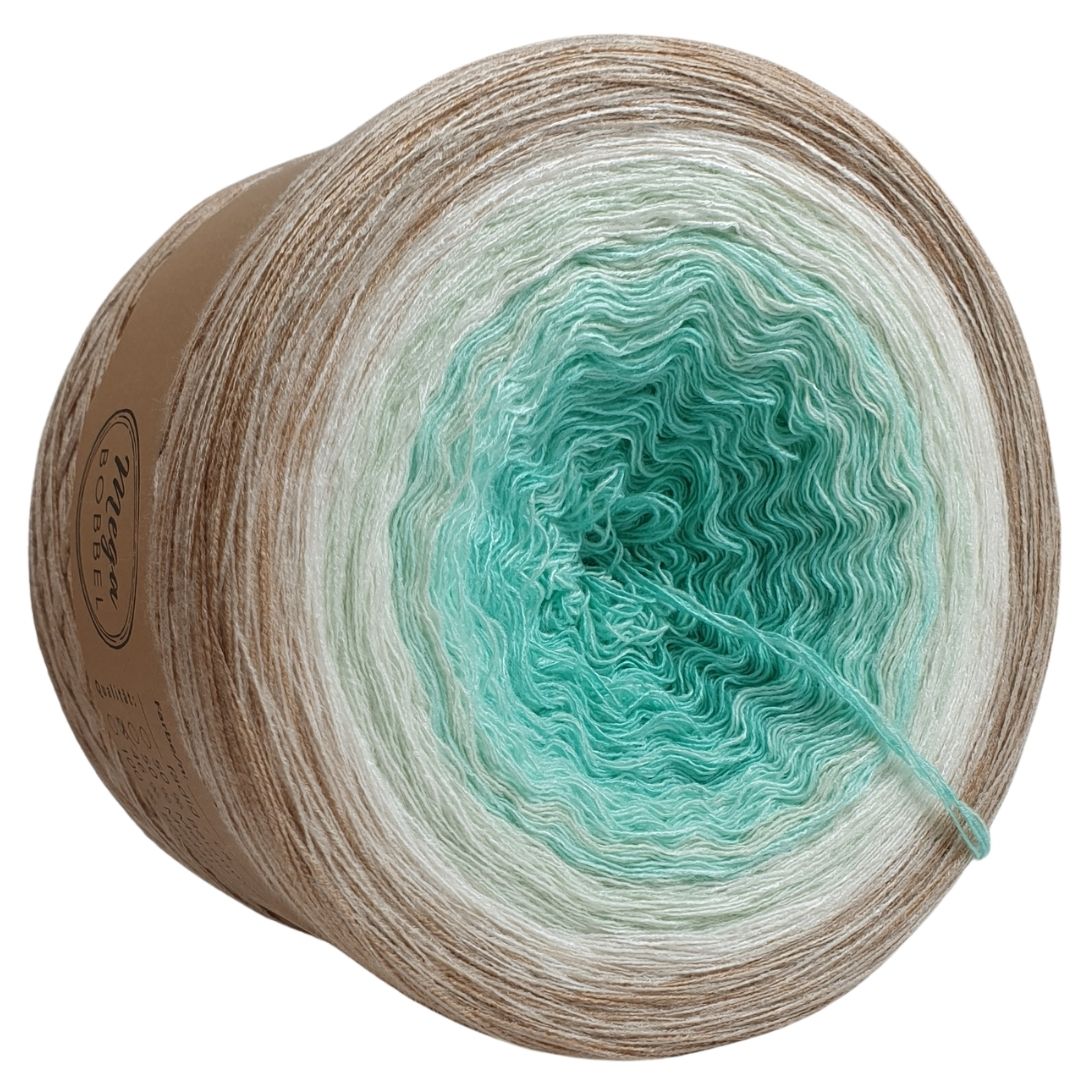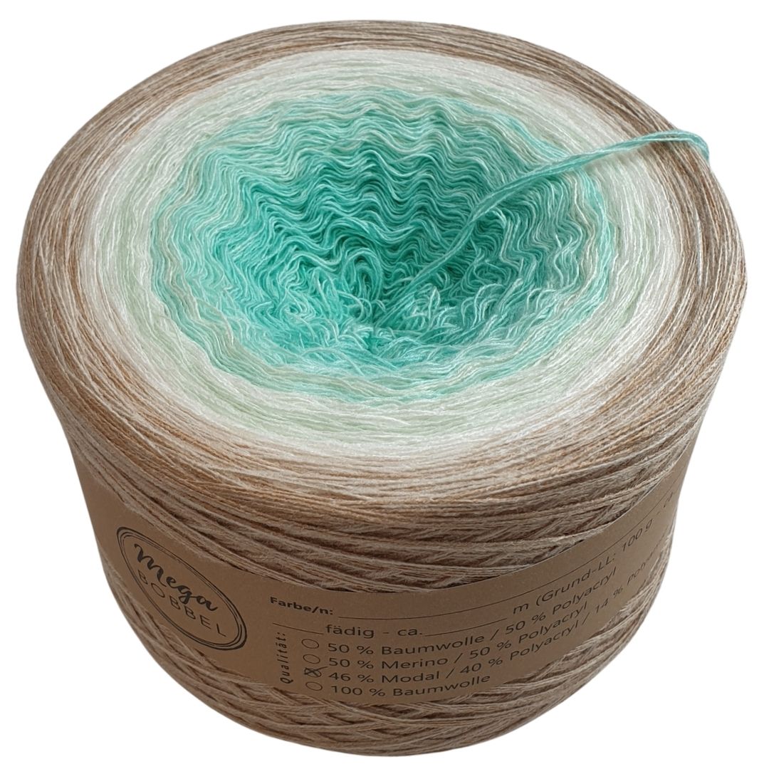 Unsere Modalverläufe sind gefachte Garne bei denen mehrere Fäden nebeneinander liegen und den Arbeitsfaden bilden. Der Farbverlauf entsteht dadurch, dass einzelne Fäden von einer Farbe zur nächsten verknotet werden. Damit die Knötchen im fertigen Stück kaum bis gar nicht mehr sichtbar sind, schneiden wir sie kurz ab. Dadurch lässt sich das Garn auch super verarbeiten, da keine Fäden vernäht werden müssen. Unsere Modalbobbel wickeln wir außerdem standardmäßig mit gleich langen Abschnitten, sodass sie von innen und außen abgearbeitet werden können.