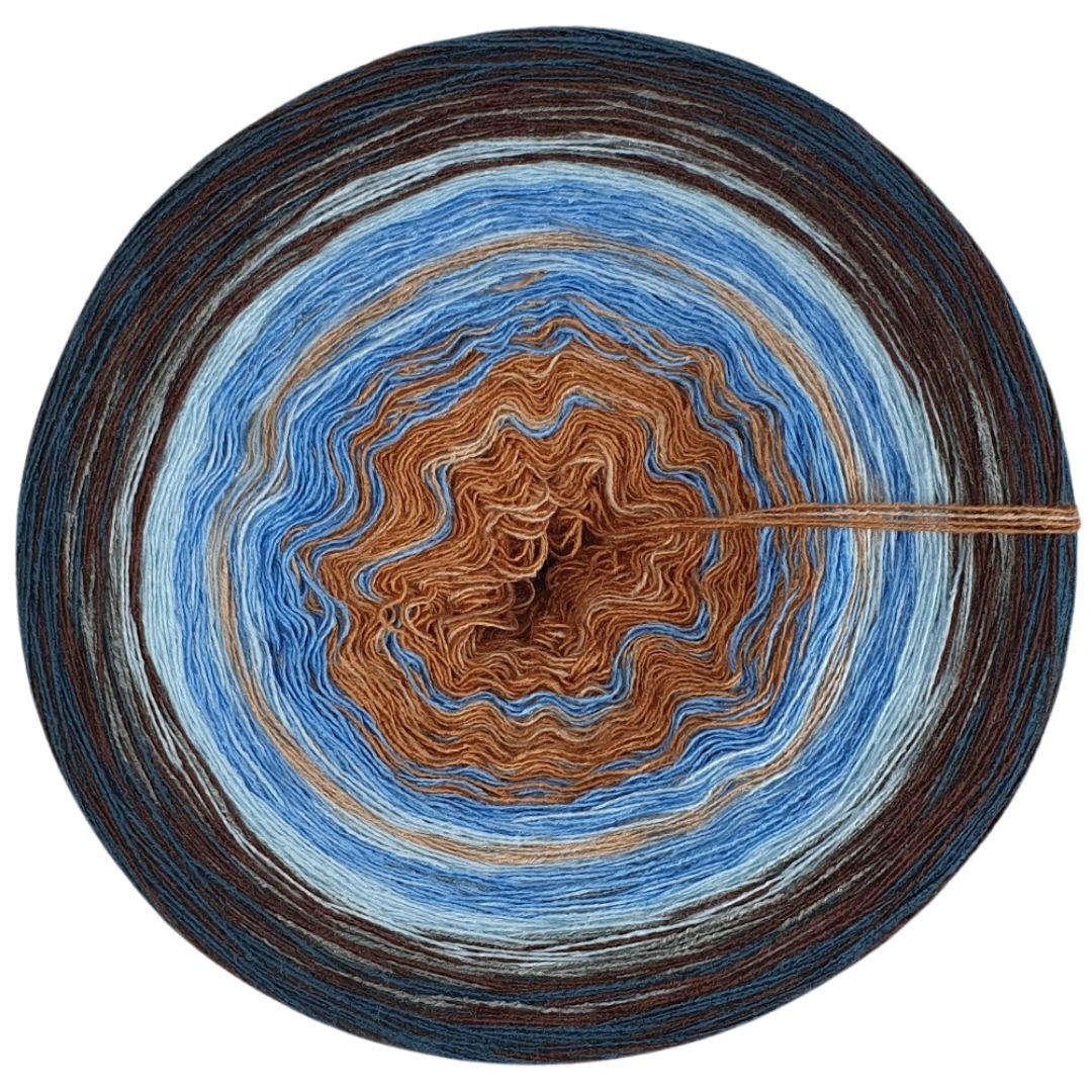 Unsere Modalverläufe sind gefachte Garne bei denen mehrere Fäden nebeneinander liegen und den Arbeitsfaden bilden. Der Farbverlauf entsteht dadurch, dass einzelne Fäden von einer Farbe zur nächsten verknotet werden. Damit die Knötchen im fertigen Stück kaum bis gar nicht mehr sichtbar sind, schneiden wir sie kurz ab. Dadurch lässt sich das Garn auch super verarbeiten, da keine Fäden vernäht werden müssen. Unsere Modalbobbel wickeln wir außerdem standardmäßig mit gleich langen Abschnitten, sodass sie von innen und außen abgearbeitet werden können.