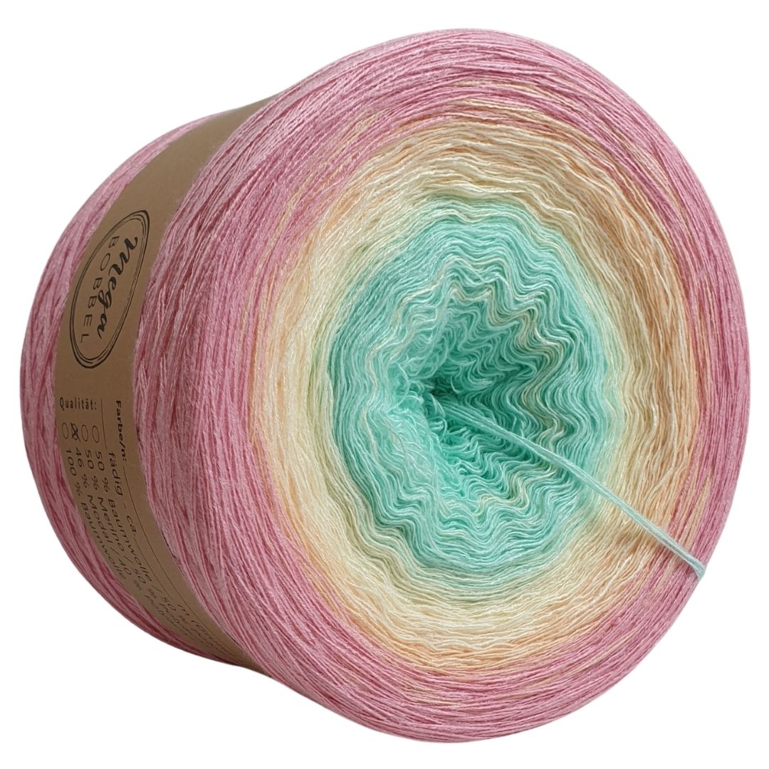 Unsere Modalverläufe sind gefachte Garne bei denen mehrere Fäden nebeneinander liegen und den Arbeitsfaden bilden. Der Farbverlauf entsteht dadurch, dass einzelne Fäden von einer Farbe zur nächsten verknotet werden. Damit die Knötchen im fertigen Stück kaum bis gar nicht mehr sichtbar sind, schneiden wir sie kurz ab. Dadurch lässt sich das Garn auch super verarbeiten, da keine Fäden vernäht werden müssen. Unsere Modalbobbel wickeln wir außerdem standardmäßig mit gleich langen Abschnitten, sodass sie von innen und außen abgearbeitet werden können.
