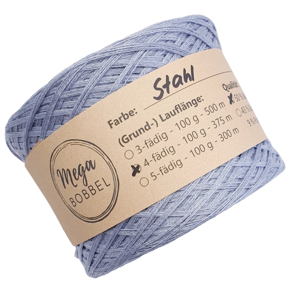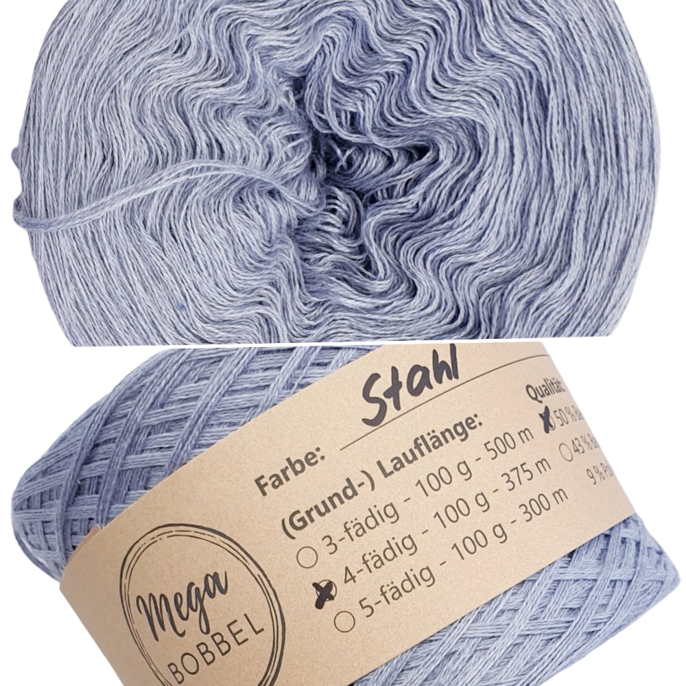 Unsere Uni-Bobbel sind gefachte Lacegarne bei denen mehrere Fäden nebeneinander liegen und den Arbeitsfaden bilden. Sie sind sehr gut geeignet, um dein begonnenes Projekt zu verlängern oder ergeben in Kombination mit unseren anderen Uni-Garnen tolle Patchworkstücke. Das Baumwollmischgarn, das wir zum Wickeln unserer Bobbel verwenden, ist superweich und pflegeleicht in der Reinigung. Außerdem können unsere einfarbigen Garne für dickere Jacken, Pullover oder Decken auch gut doppelt verarbeitet werden. Dazu werden 2 gleiche Bobbel derselben Fädigkeit, Länge und Außenfarbe gemeinsam verarbeitet. In der Regel empfehlen wir eine Nadelstärke von 3-4. Wenn die Garne doppelt verarbeitet werden, sollte die Nadelgröße auf 6-10 angepasst werden.